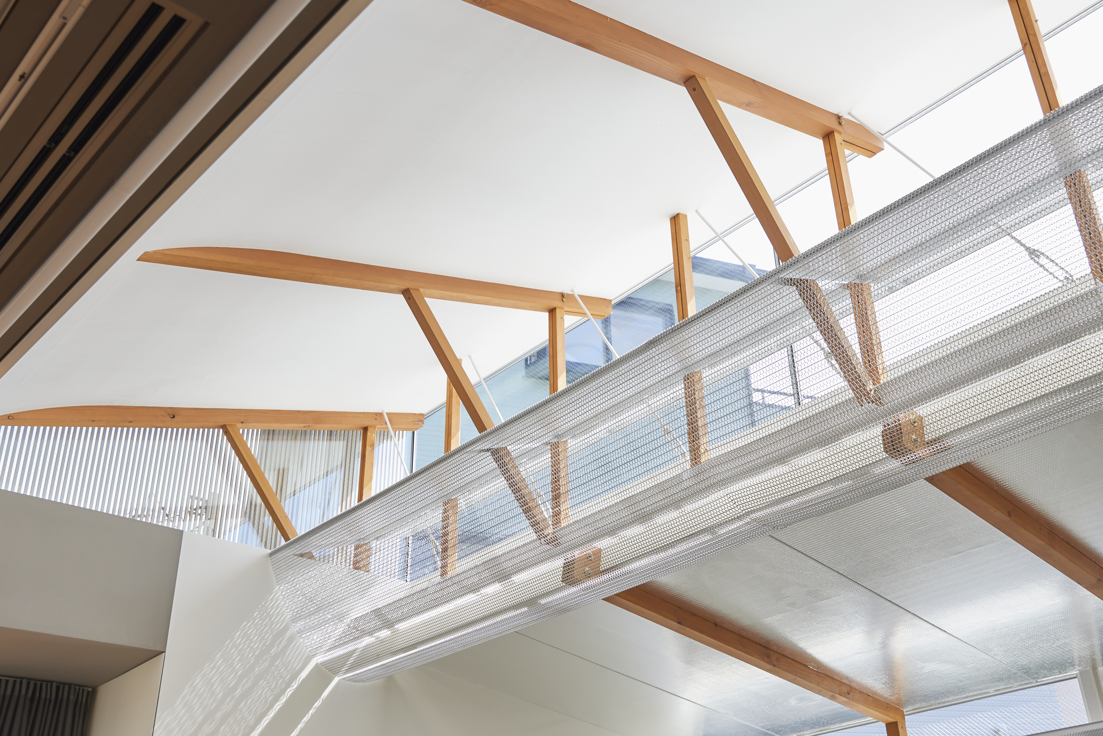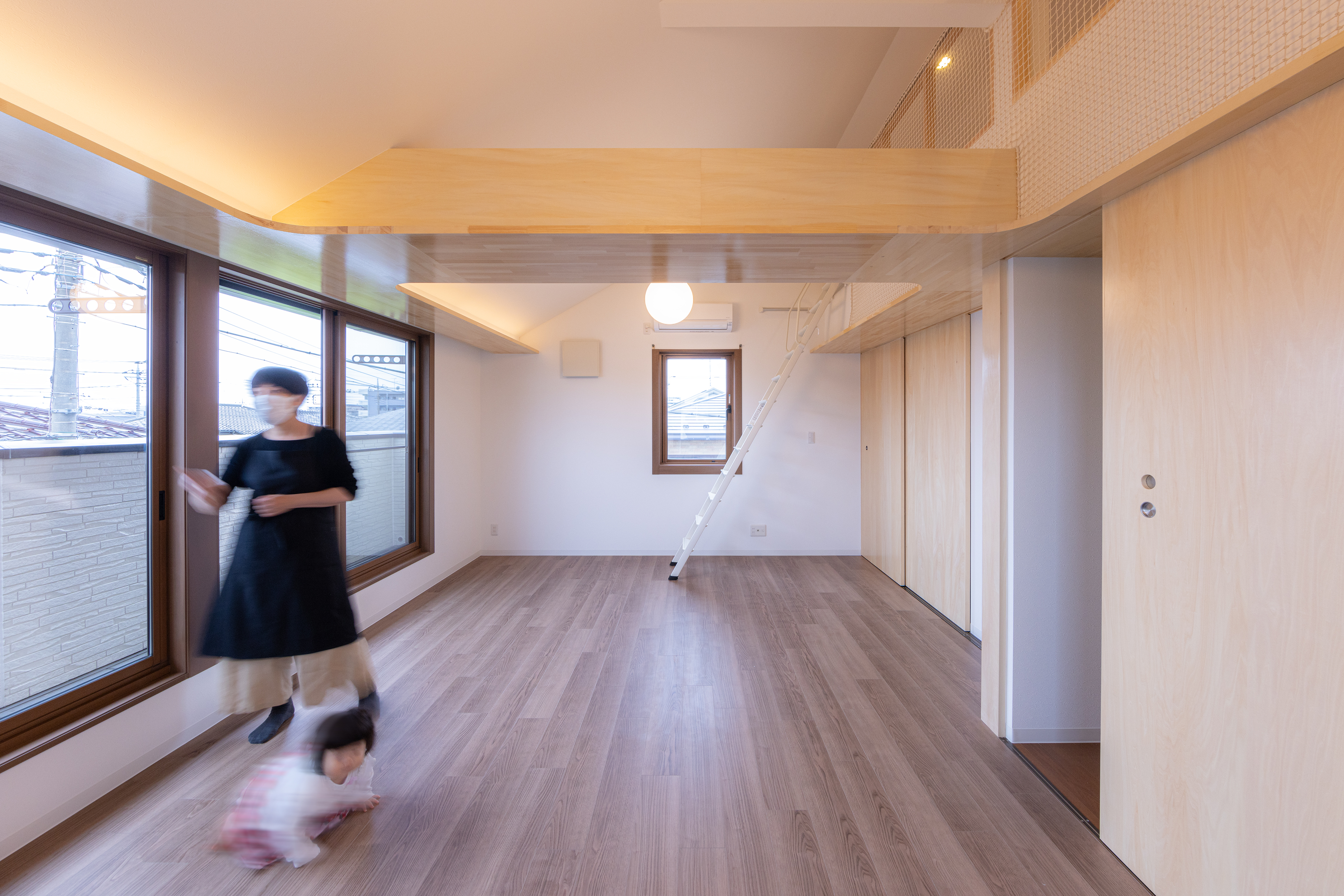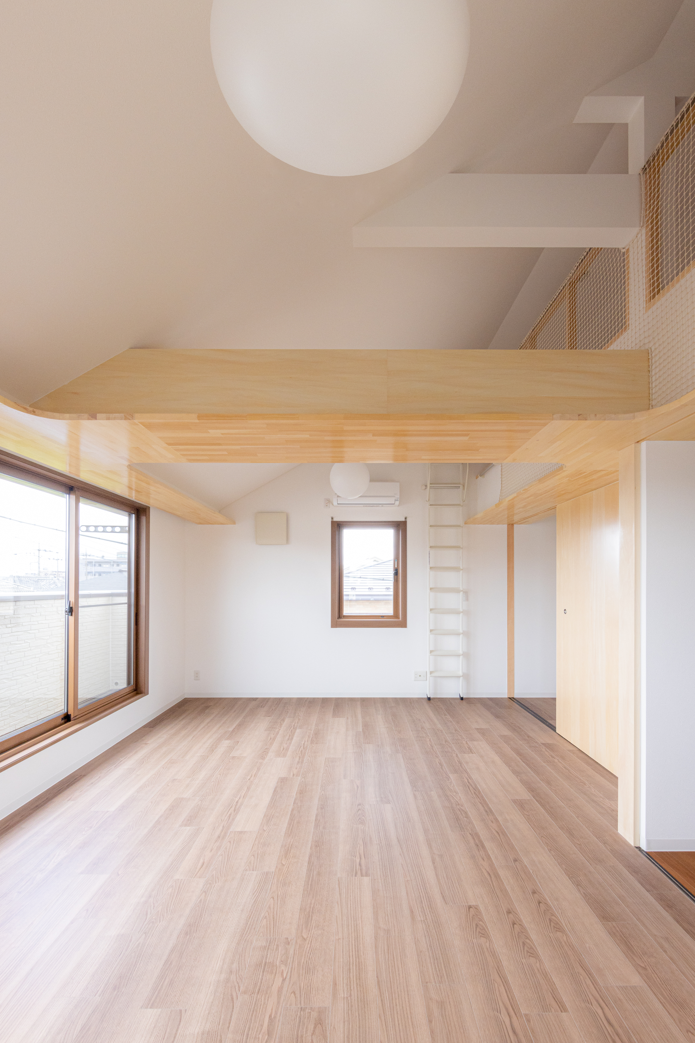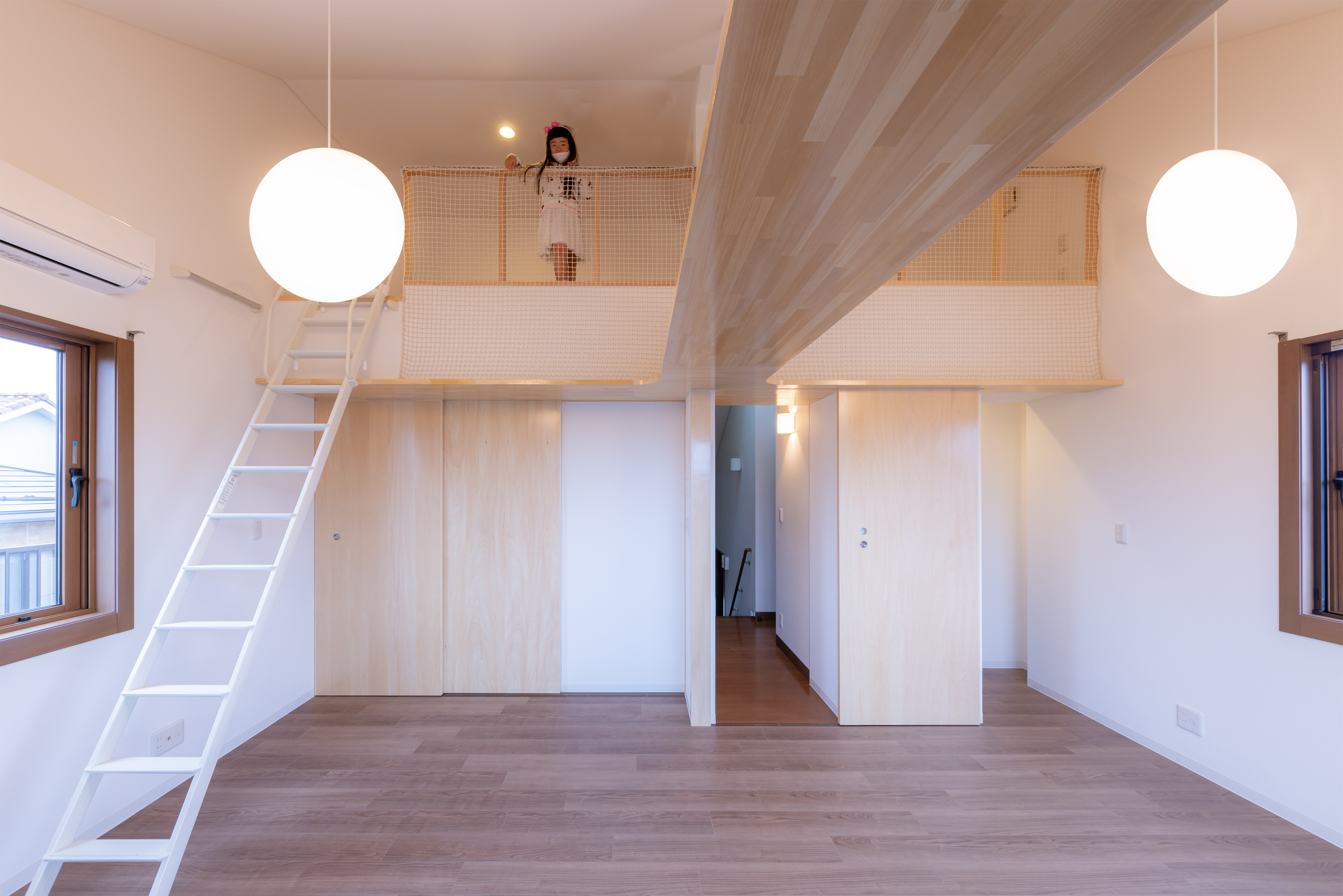 ロフトの立ち上りを下げて手摺とネットを付けることで、広がりをつくると同時に子供達が安心して遊べる様にしています。