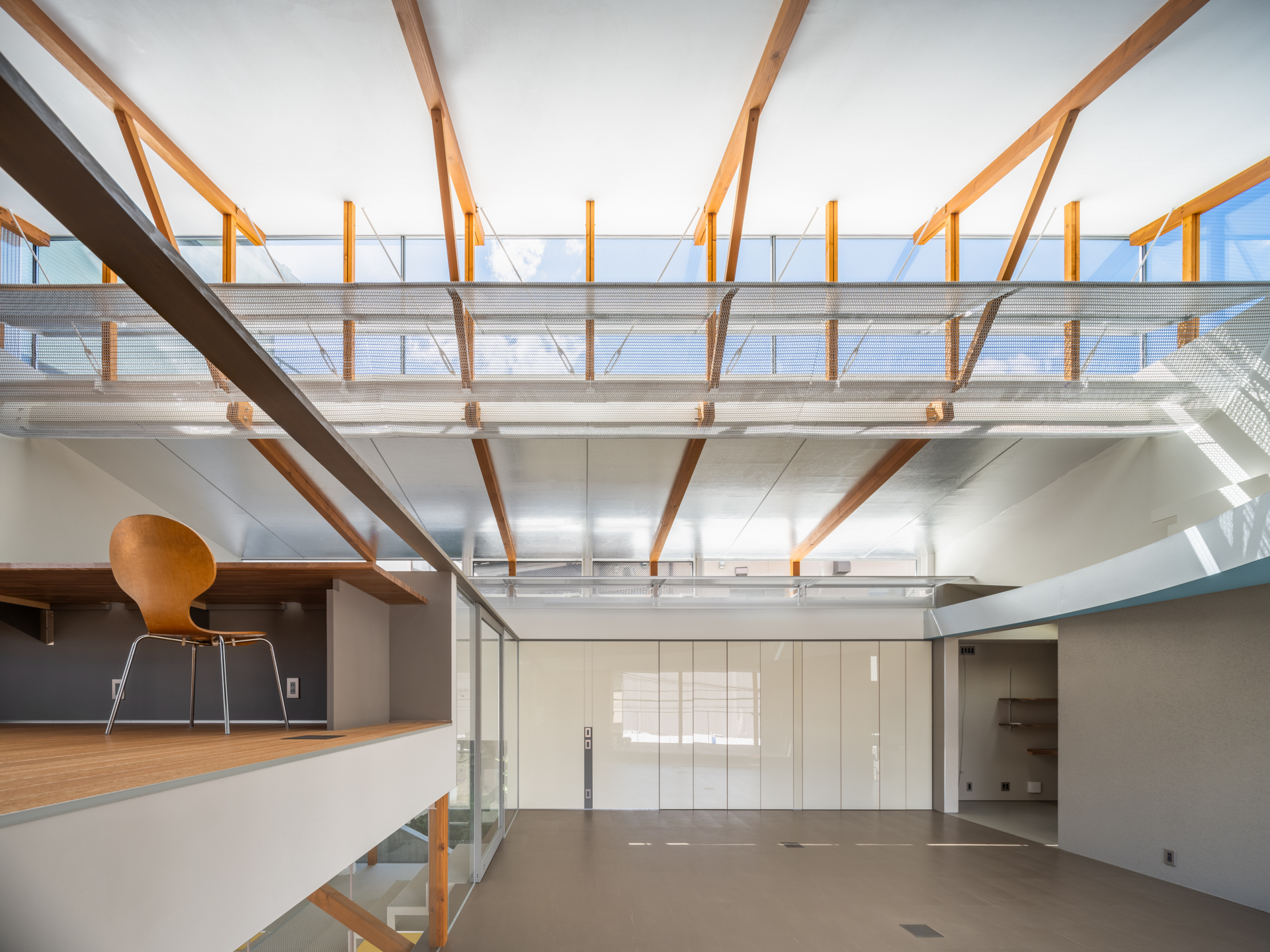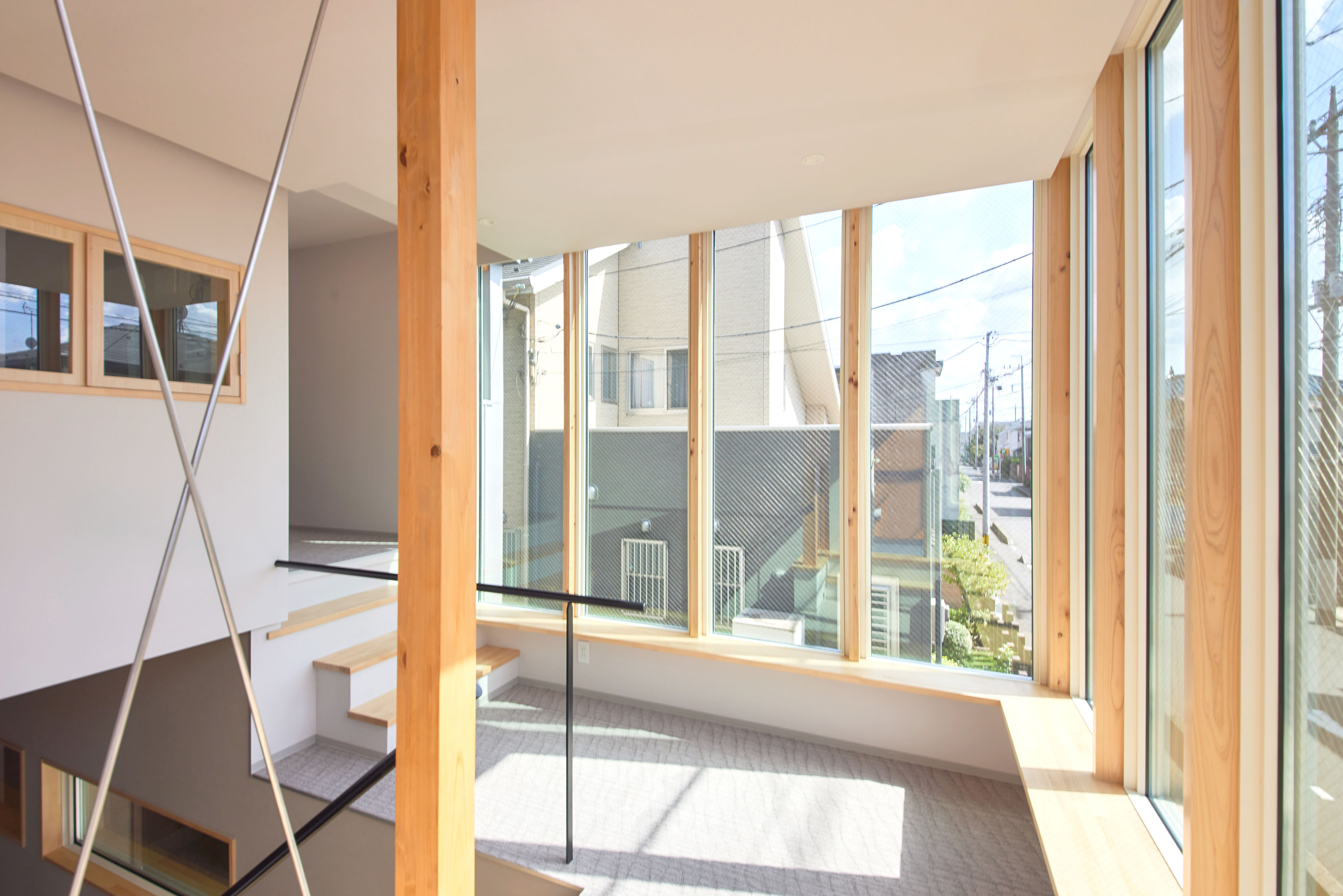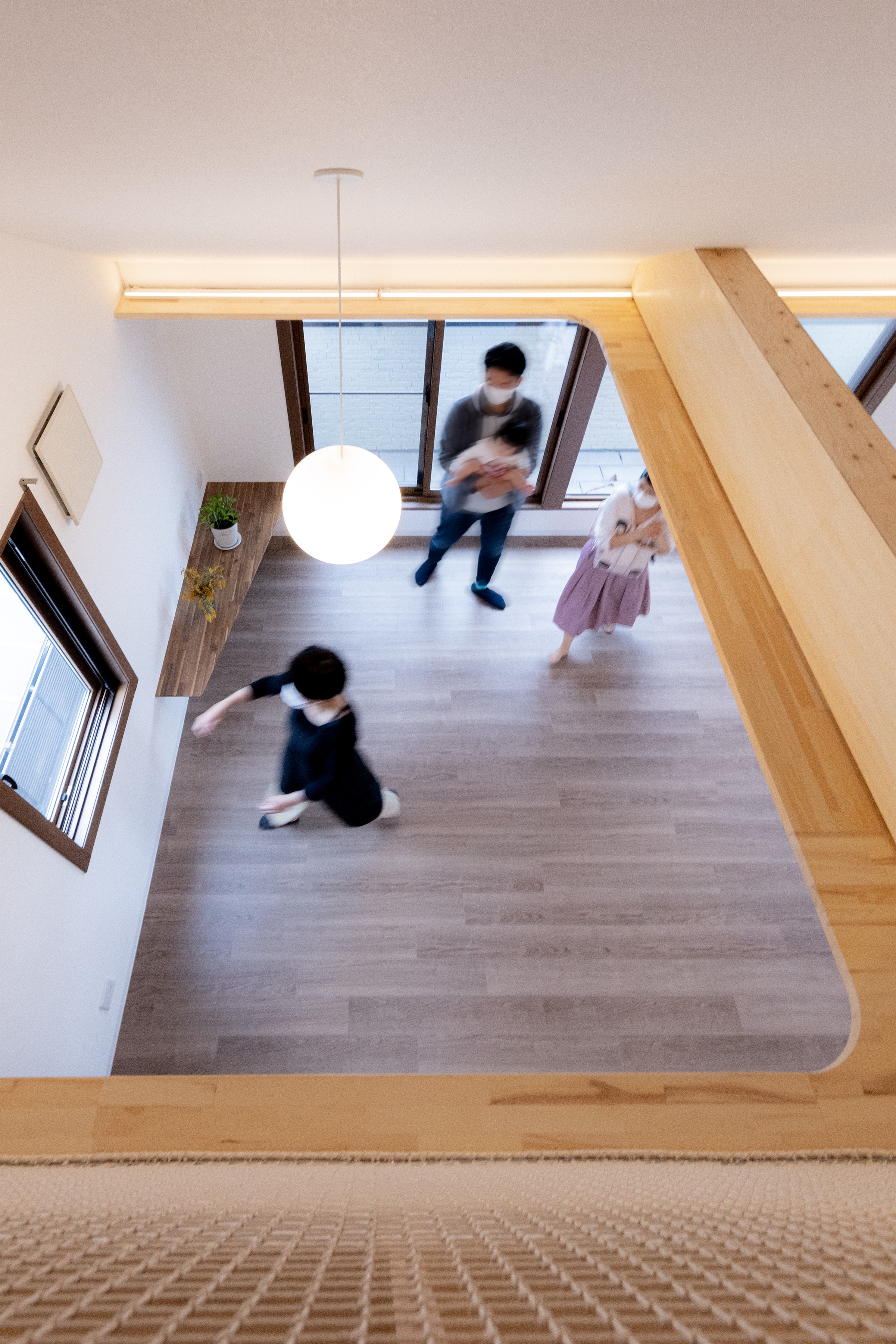 ロフトの立ち上りを下げて手摺とネットを付けることで、広がりをつくると同時に子供達が安心して遊べる様にしています。