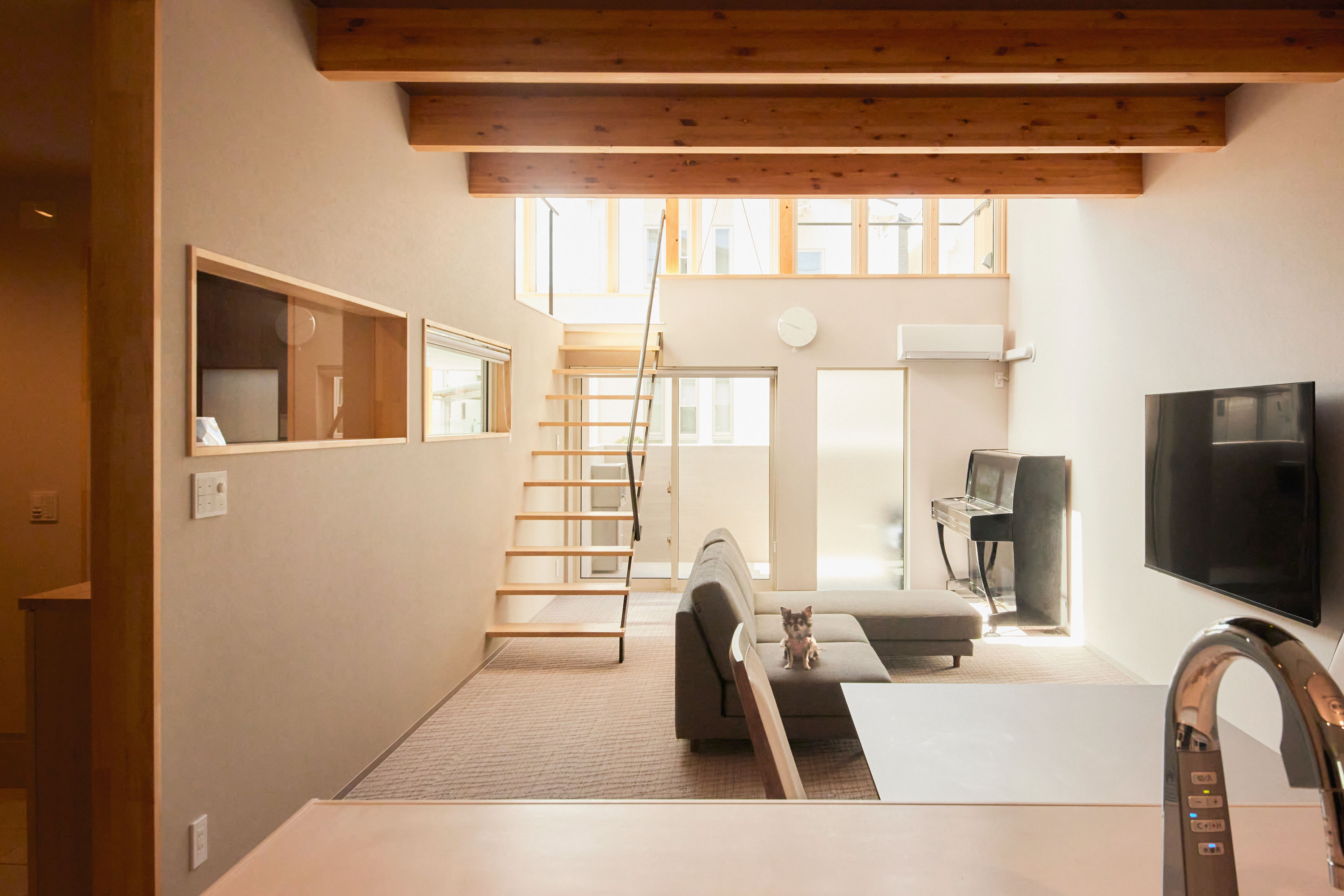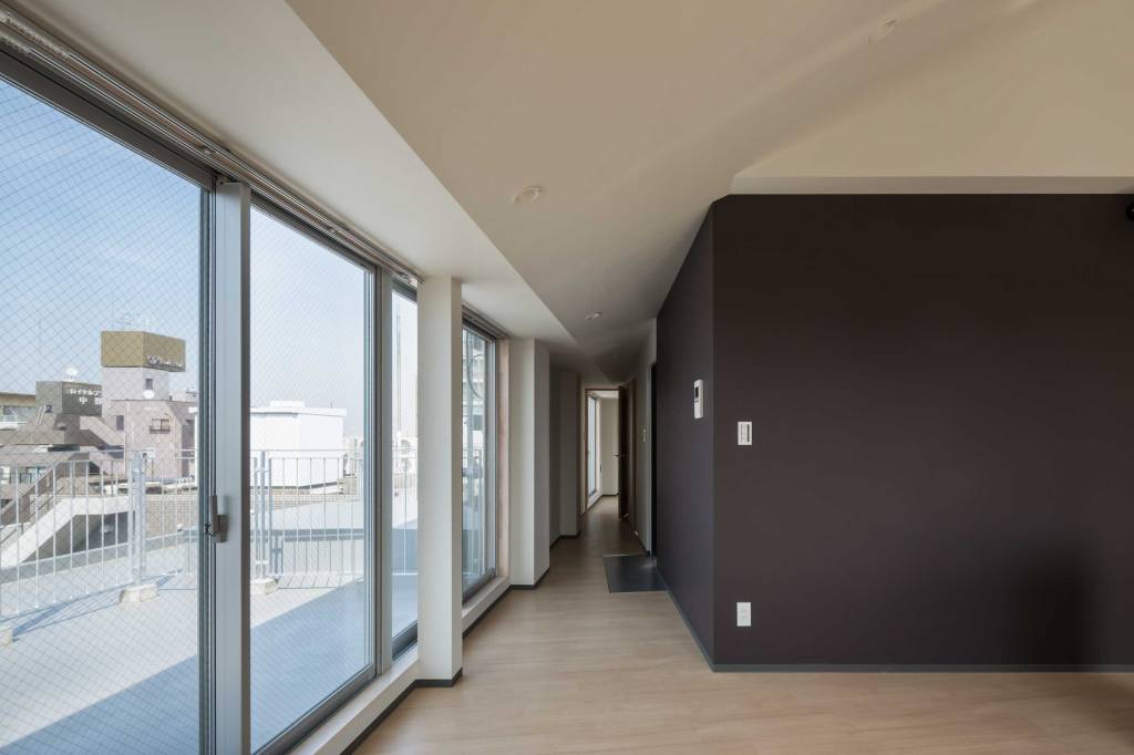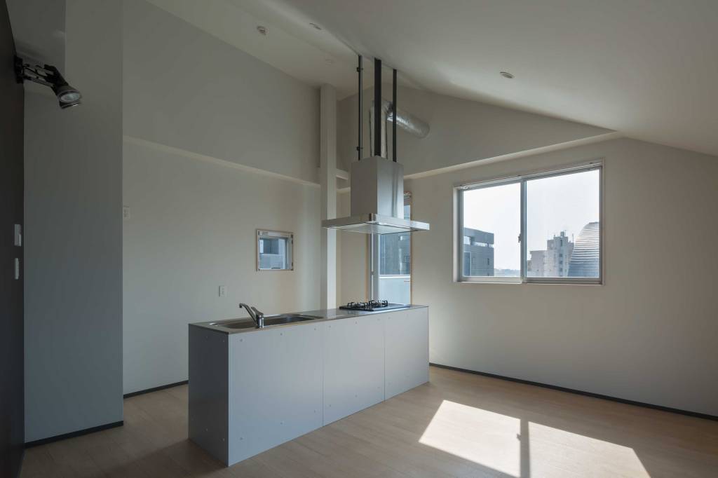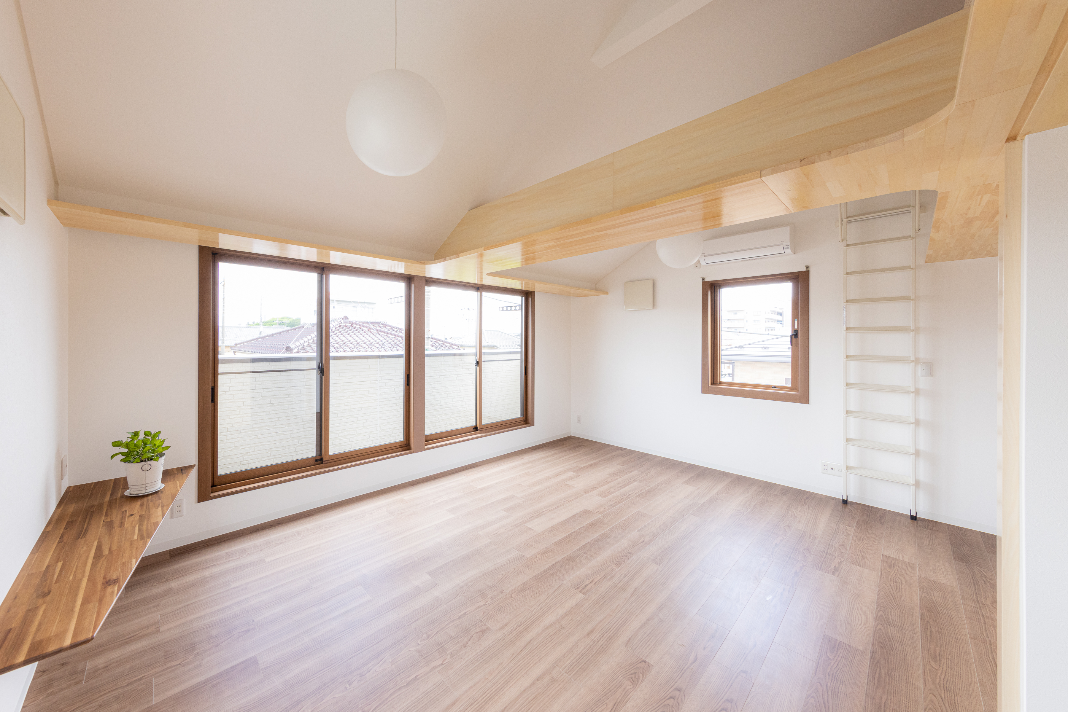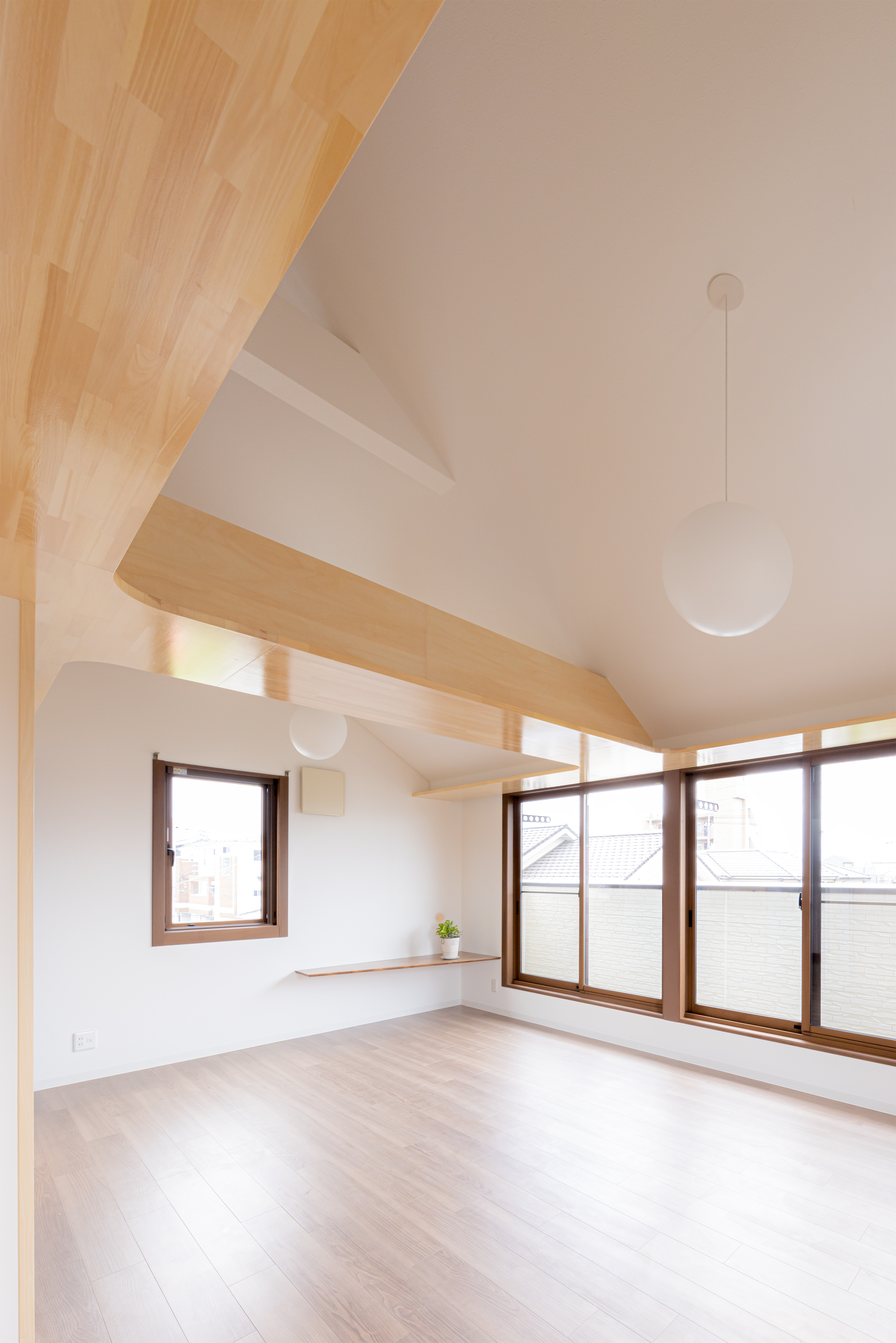 部屋の間にあった壁を取り除き、ロフトを繋げ、梁の下・窓の高さに集成板を挿入して、窓も天井も新たに切り抜かれた様にみせることで、内にも外にもつながっていくような広がりを感じる空間にしました。