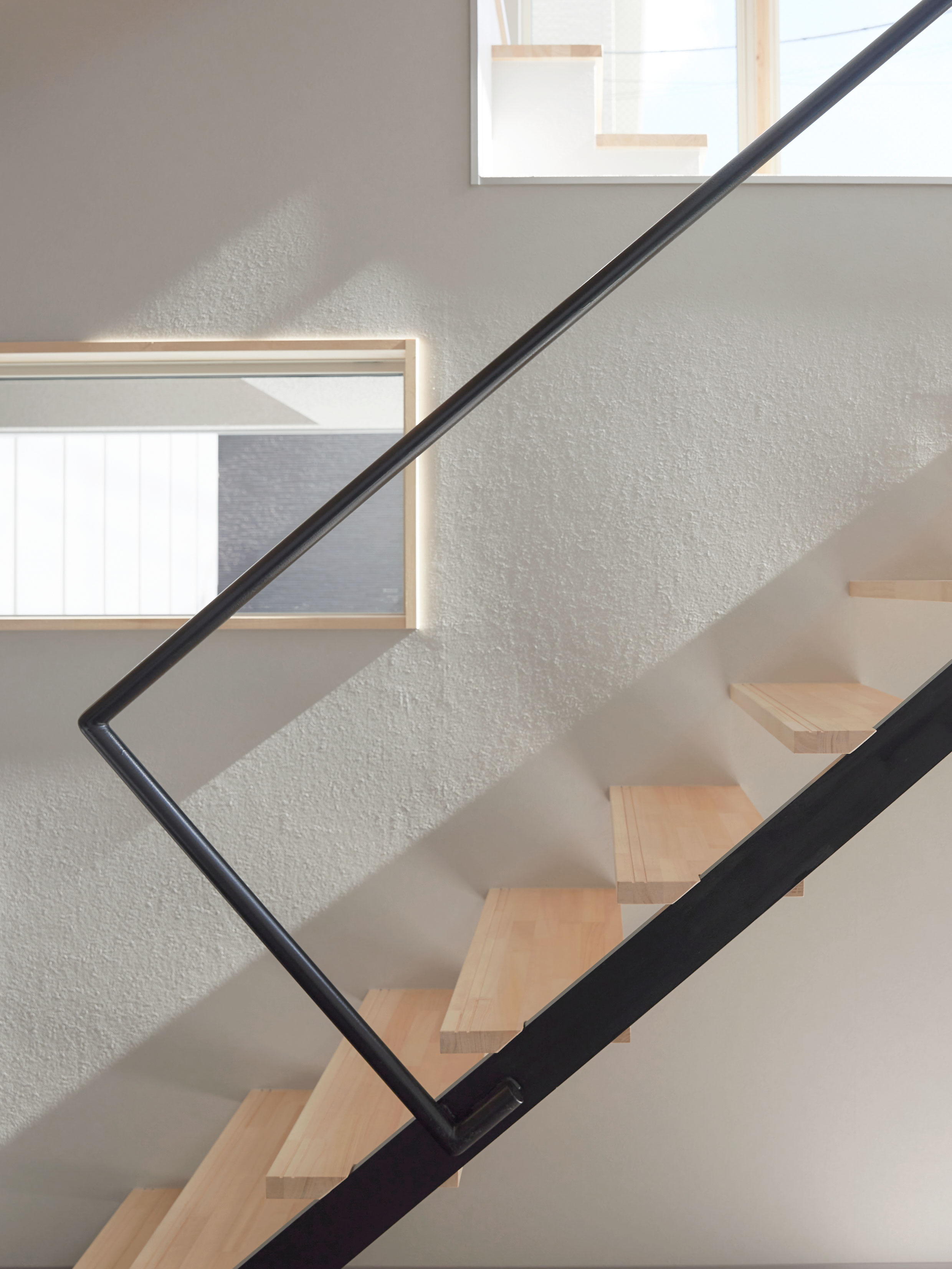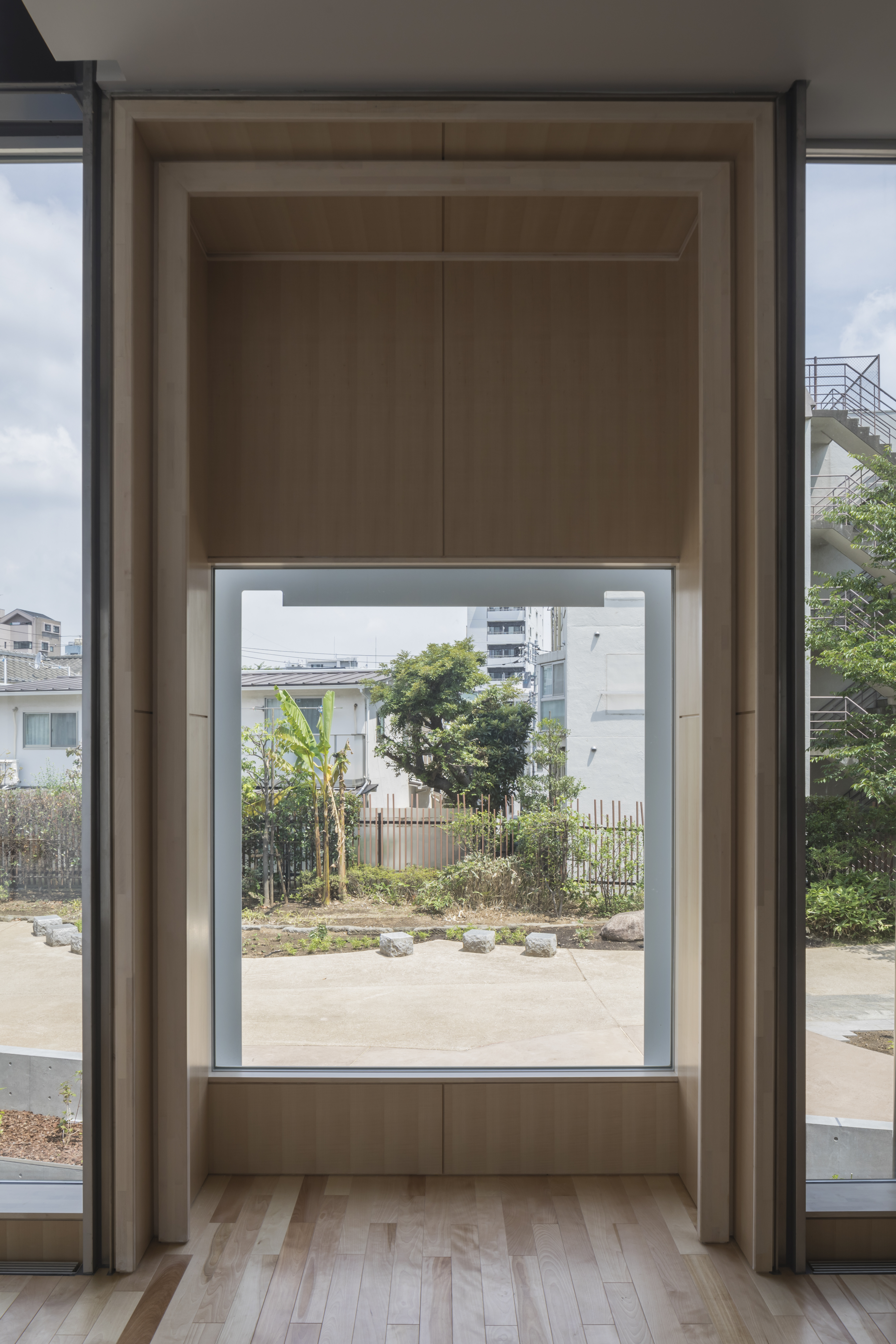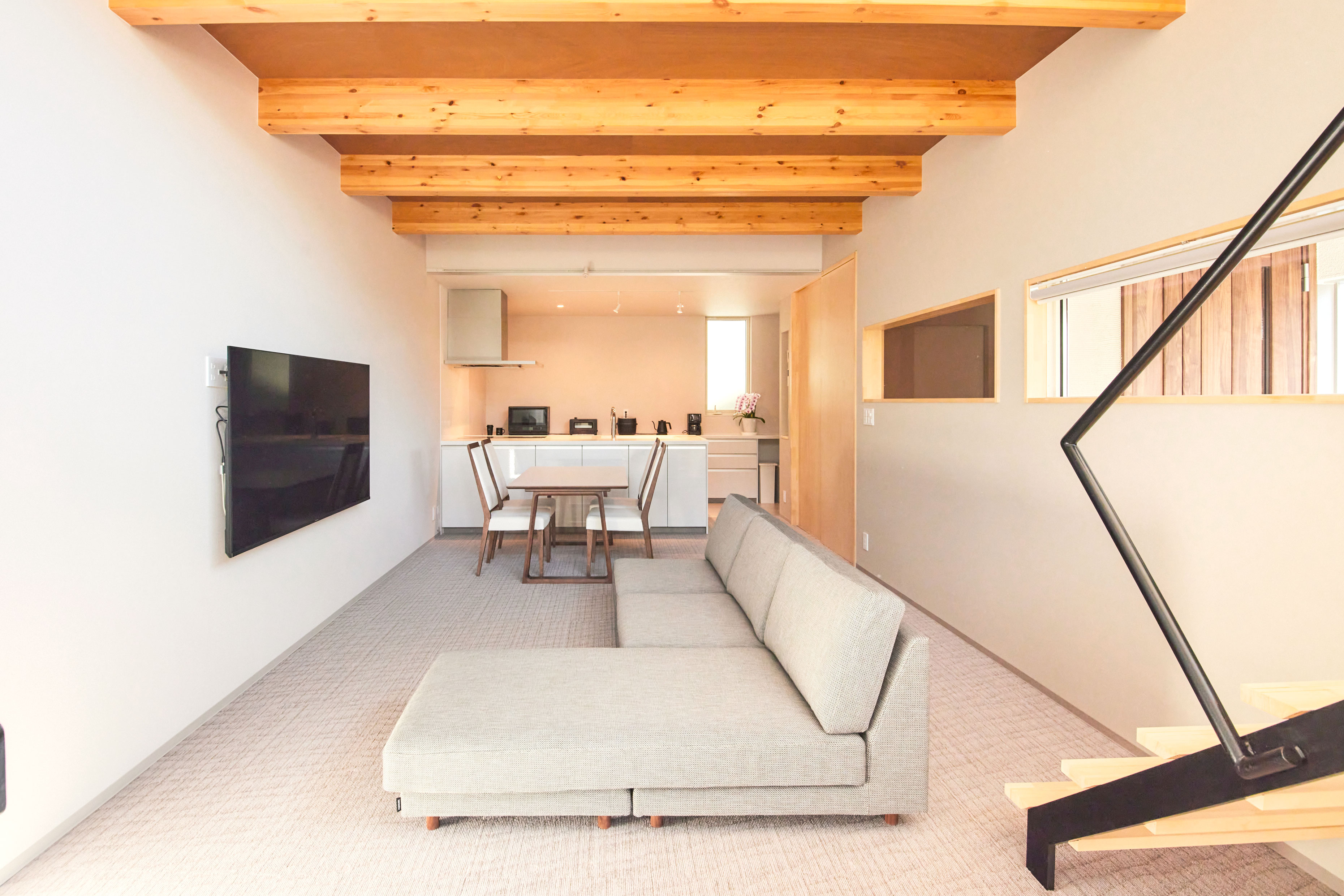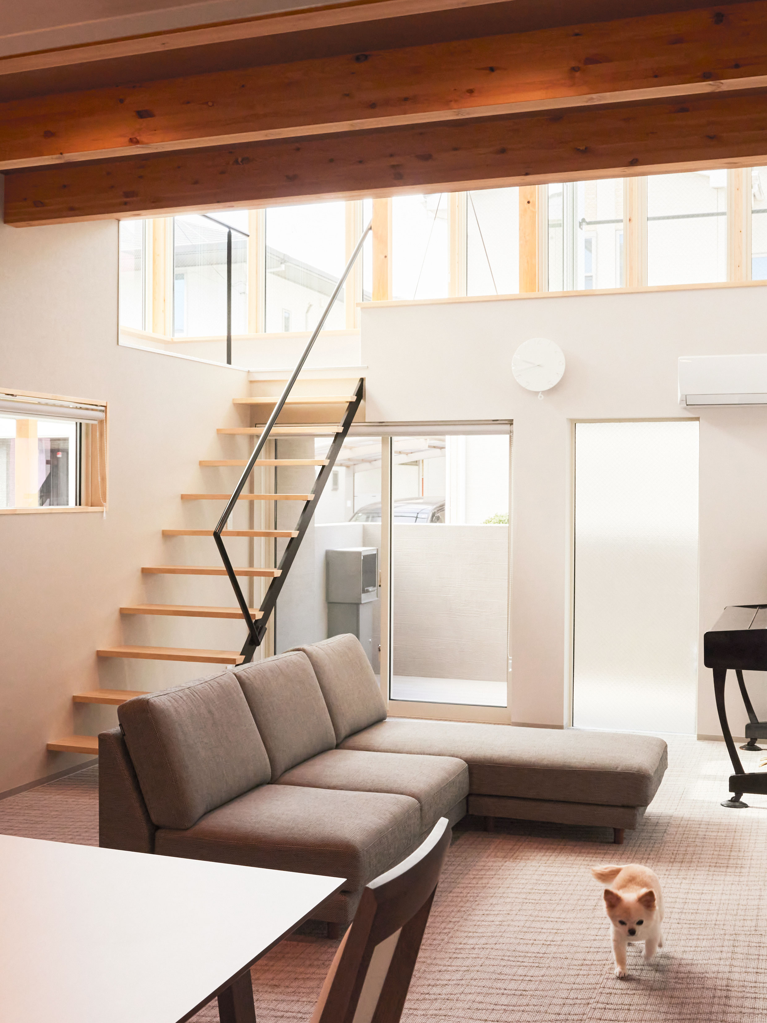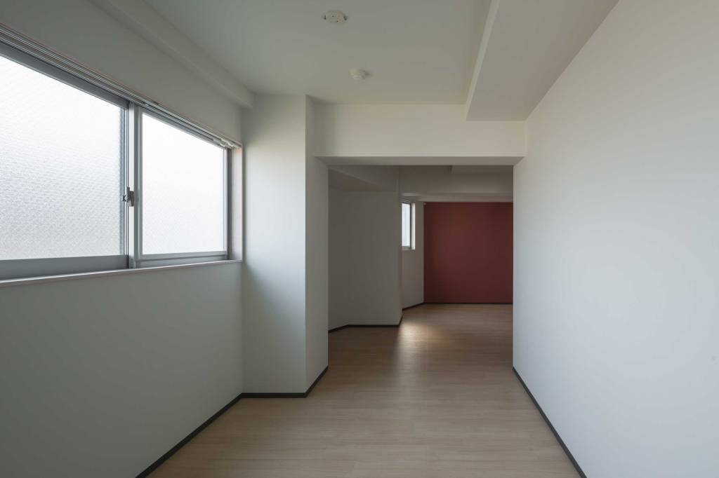 部屋の間にあった壁を取り除き、ロフトを繋げ、梁の下・窓の高さに集成板を挿入して、窓も天井も新たに切り抜かれた様にみせることで、内にも外にもつながっていくような広がりを感じる空間にしました。